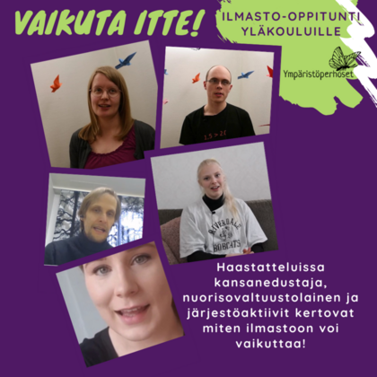 Vaikuta Itte -ilmasto-oppitunti on suunnattu yläkouluille. Oppitunnin aiheena on erilaiset tavat vaikuttaa itse ilmastoon. Tunnin materiaalina on mm. nuorten kuvaamia haastatteluvideoita, joilla kansanedustaja, nuorisovaltuustolainen ja järjestöaktiivit kertovat erilaisista vaikuttamisen keinoista.